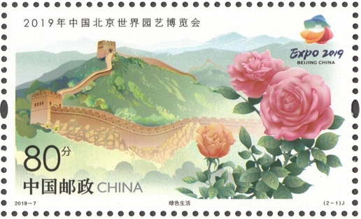 《2019年中国北京世界园艺博览会》纪念邮票一套2枚,邮票图案名称分别为:绿色生活、美丽家园。邮票第一图画面以在青山间蜿蜒的长城、北京市市花——月季以及本次世园会的会徽——长城之花为主要元素,寓意园艺源于自然,倡导尊重自然、融入自然的理念,也突出了“中国风格”和“北京品牌”;邮票第二图画面以本次世园会国际馆、中国馆以及吉祥物“小萌芽”“小萌花”为主要元素,整体画面生机盎然、朝气蓬勃,启示人们应当树立绿色、低碳、环保的生产生活理念。