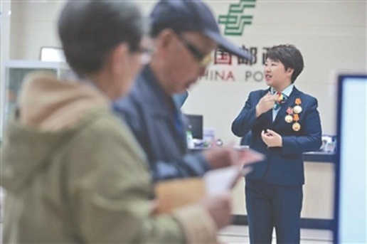 当天上午,作为局长助理的陈兰颖也在忙乎着,一天下来,光在邮局大楼里就走了1万多步。快中午时,来了一位聋哑人,陈兰颖上前和他用手语交流,一直陪他办理完业务。陈兰颖喜欢把东四邮局说成是“家”:“我们局就像一个大家庭,我在这个家感觉特别舒心,我们还要把这种舒心传递给用户,让大家都舒心。”