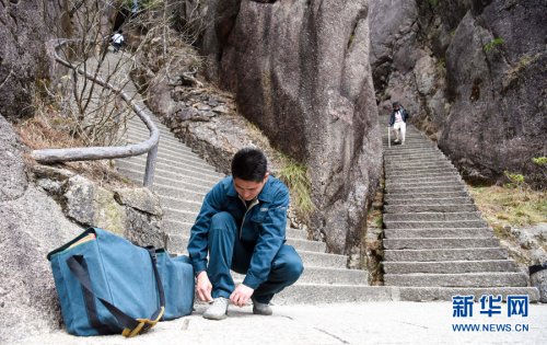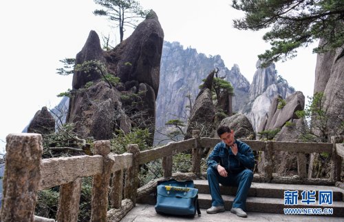 3月16日,休息间隙,谢菲俊放下邮包,一边擦汗一边欣赏黄山美景。