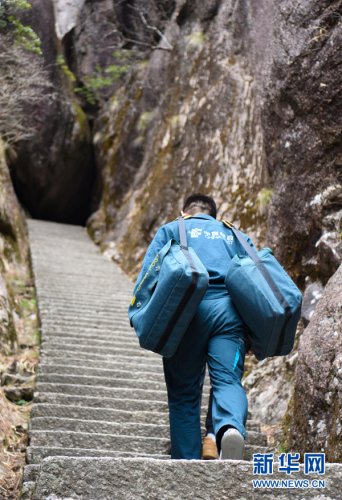 3月16日,谢菲俊背着邮包拾级而上。