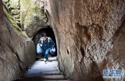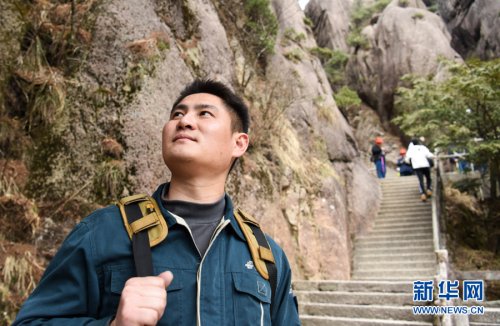 3月16日,黄山风景区内,谢菲俊背着邮包仰望山顶。
