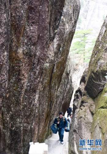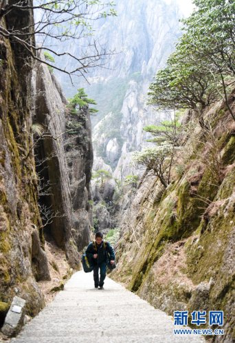 黄山素有“三十六大峰,三十六小峰”之称,主峰莲花峰海拔高达1864.8米。风景区内,山路崎岖、不通车马,山上工作人员和游客所需的报刊、信件等,只能靠谢菲俊背着邮包送上山。