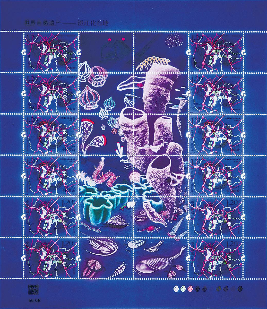 2024年是澄江遗址发现40周年,中国邮政在4月18日“世界遗产日”当天发行《世界自然遗产——澄江化石地》特种邮票一套3枚。在邮票主图中,设计师用彩铅的手法绘制中华微网虫化石、环饰蠕虫与吸盘古宿虫共生化石和延长抚仙湖虫化石,并叠加澄江地图;邮票附图中不仅展示了三种化石的复原图,更展示了多达37个古生物所组成的海底古生物群落的生活场景。