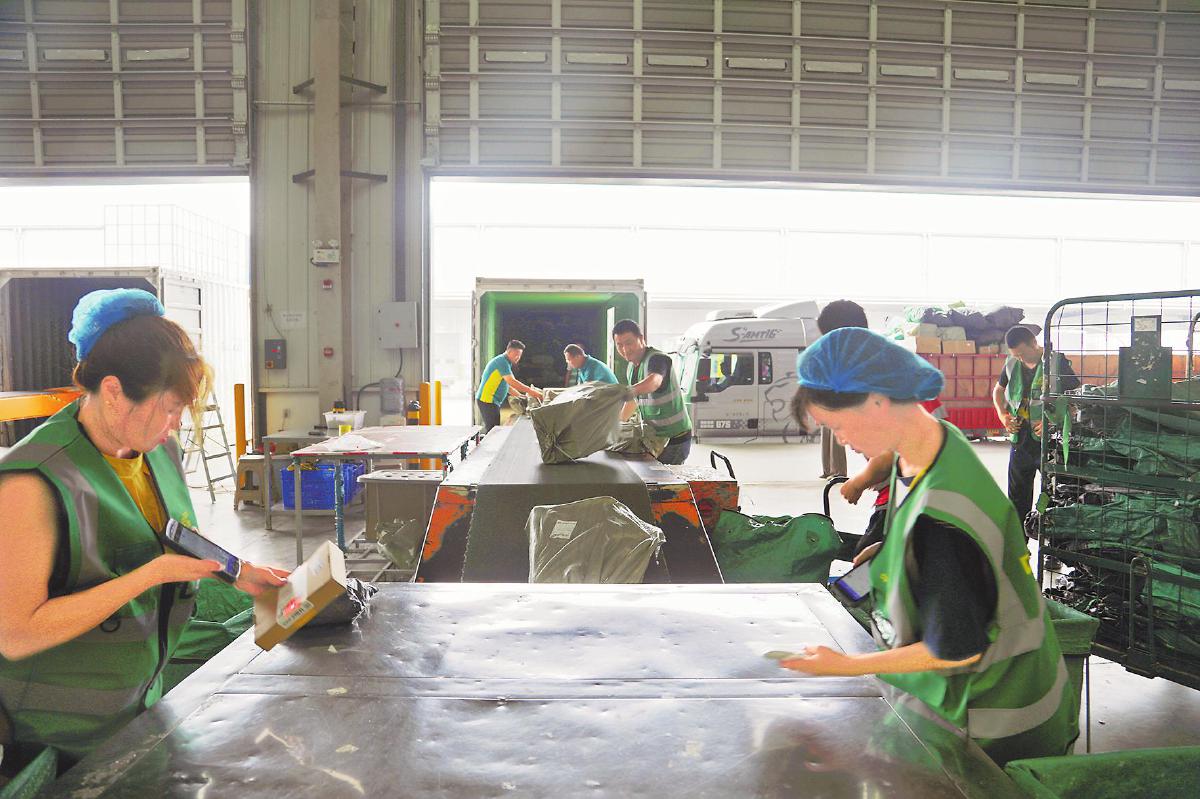 陕西邮政工作人员在仓储中心处理发往新疆的邮件。 □姚海龙 摄
