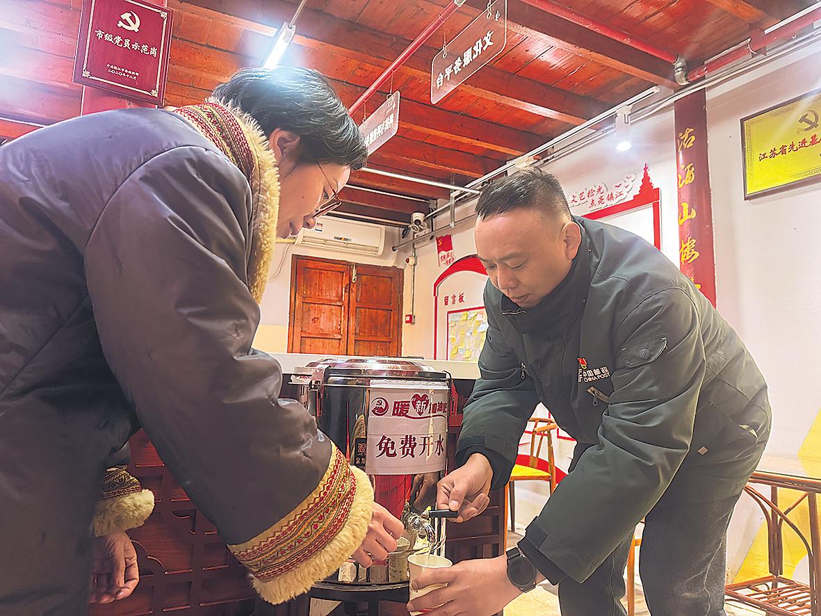 镇江邮政党员志愿者为游客提供热水。□蒋劲松 摄