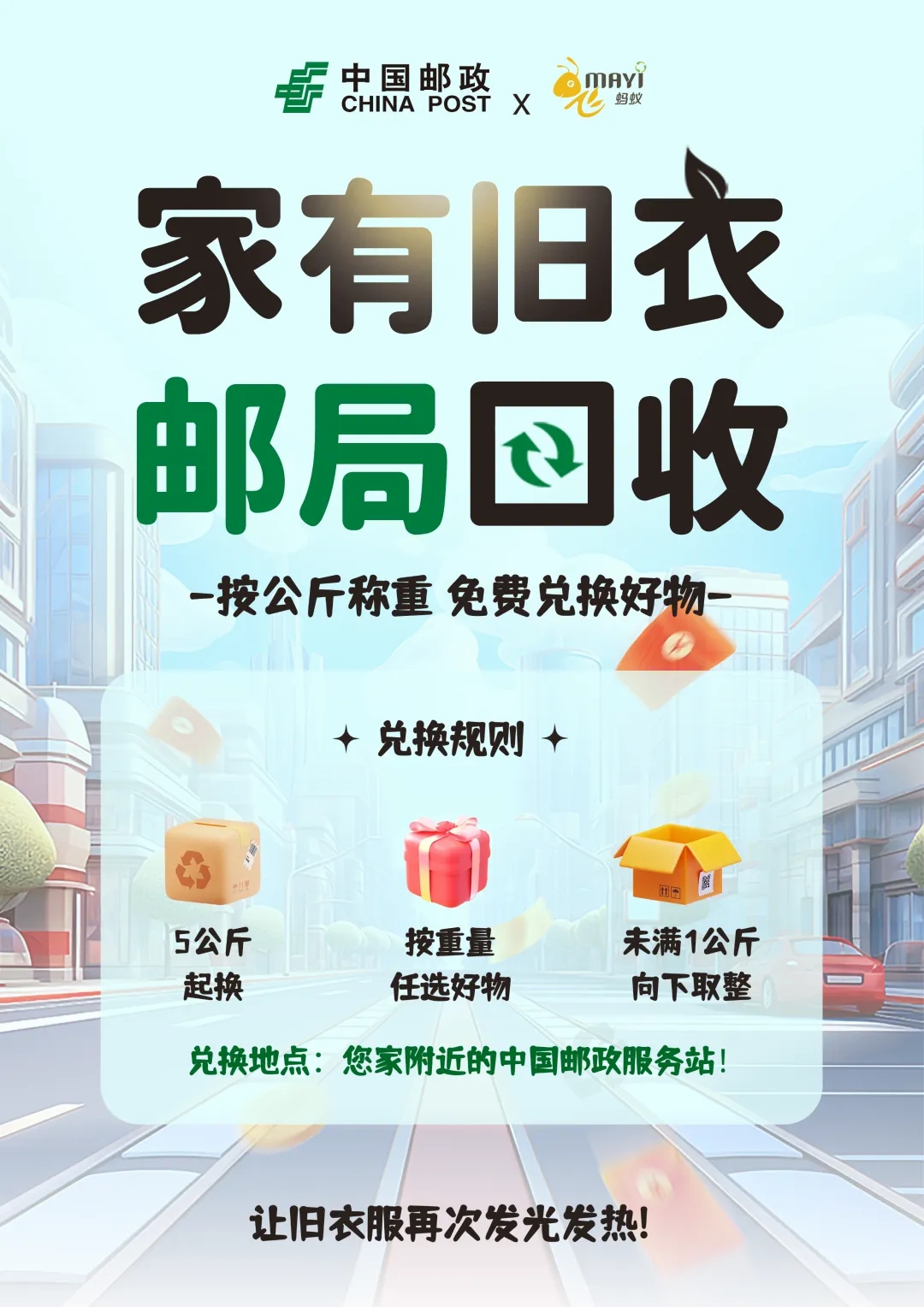 除了若干个环保主题活动,邮政的工作人员在社区现场驻守,将市民们带来的旧衣旧物进行回收、打包,并通过颁发“绿色循环贡献”证书、换取水杯等方式鼓励大家进行旧衣旧物捐赠,为环保节能贡献微薄之力。