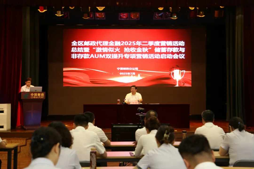 7月9日,宁夏邮政分公司召开2025年全区邮政代理金融二季度总结暨“激情似火抢收金秋”储蓄存款与非存款AUM规模双提升专项营销活动会议。