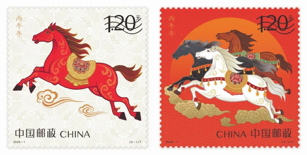 今年发行的《丙午年》特种邮票全套共2枚。第一枚邮票图案名为“驰跃宏图”,图中红马踏云、鬃毛如焰,表达了在新的一年里,对党领导下的国家社会经济发展继续行稳致远,朝“十五五”时期主要目标接续奋进的美好期许。第二枚邮票图案名为“万骏臻福”,图中三骏并驰、祥纹环绕,象征全国各族人民凝聚磅礴合力,在全面建设社会主义现代化强国、全面推进中华民族伟大复兴征程上协力同心。