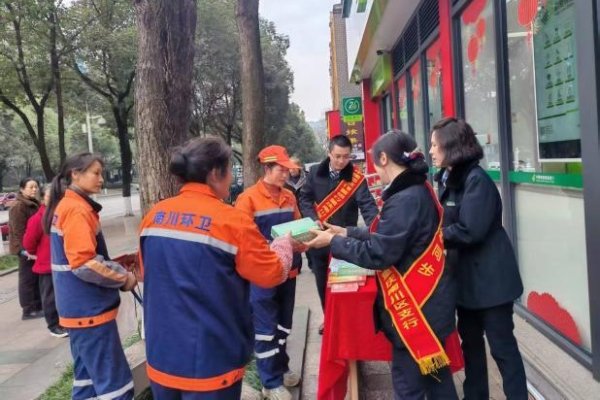 邮储银行南川支行工作人员为环卫工人送上热茶(邮储银行供图)